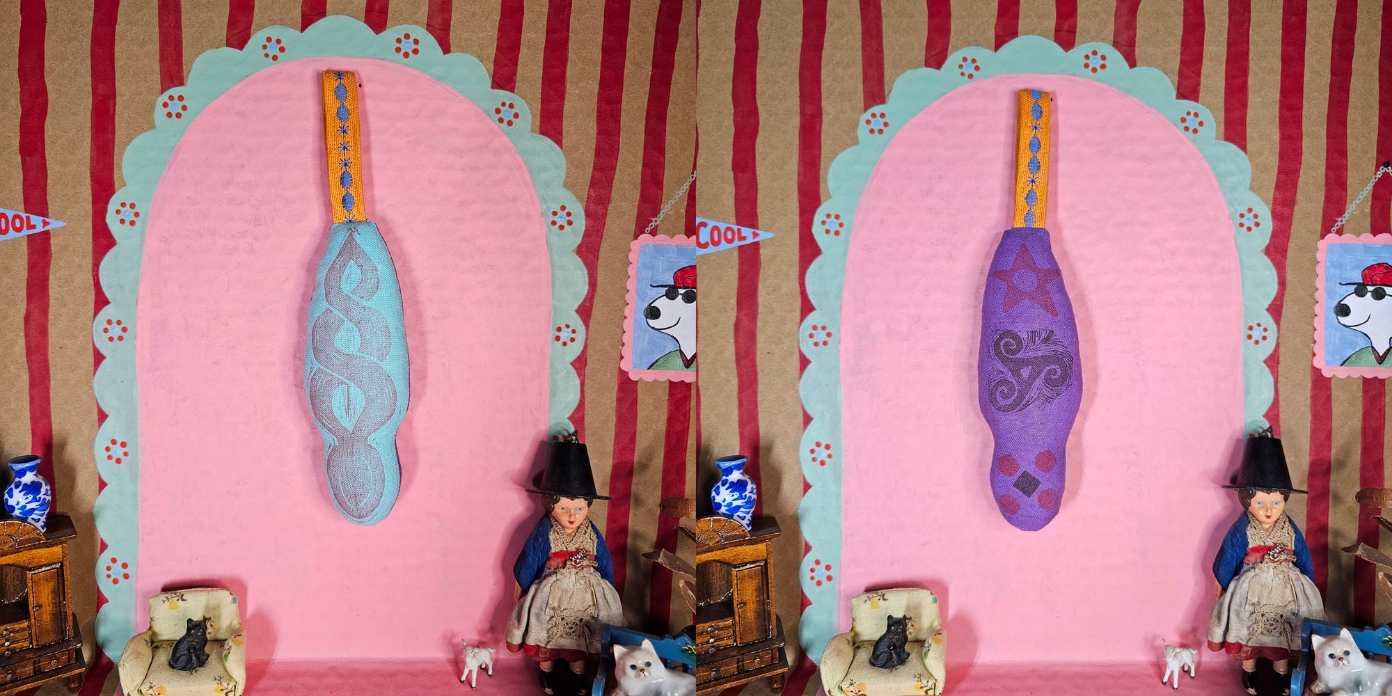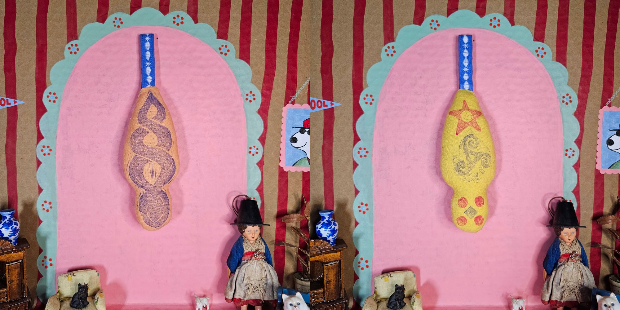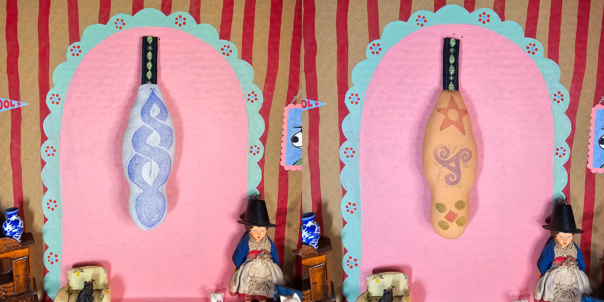 Lino printed on dyed calico with folk embroidered tab. Each hanger is unique & is backed with a different dyed calico, stamped with sigils. Images depict both the front & back of each hanger. Filled with reclaimed wadding